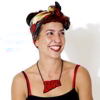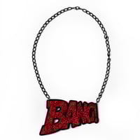 It says BANG! It's bright red, or bright red glitter. Get that guy to notice you in this eye catching necklace, then talk to him about those old Batman episodes or comics or where you got that amazing necklace. It looks cool and it'll get you the guy. Laser cut from perspex this beauty measures 10cm across.